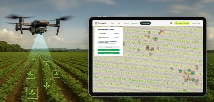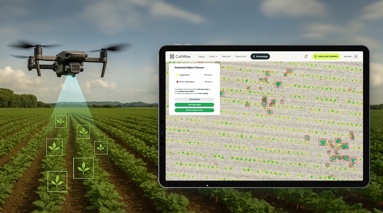 Farmers capture field images using drones with RGB cameras —flying at heights of 40 to 120 meters, depending on weed size—and upload them to the CultiWise platform. The system processes images through a proprietary AI model trained on millions of drone photos.