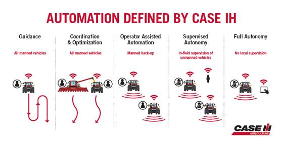 Diverse farming operations around the world require varying levels of automation. Through extensive Customer Driven Product Design research, Case IH found that current and future technology needs fall into five categories of automation for agricultural field applications. The categories and types of activities associated with each include: