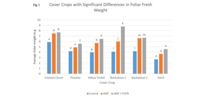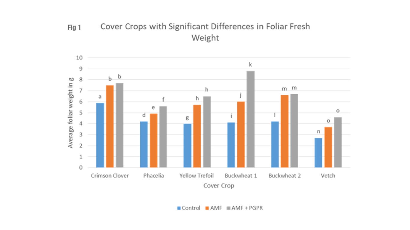 Developed by PlantWorks’ own team of microbiologists in conjunction with academic partners, SR2 comprises five species of arbuscular mycorrhizal fungi (AMF) and a specific consortium of plant growth promoting rhizobacteria (PGPR). Trials with cover crops including species such as vetch, crimson clover, black oats, buckwheat and yellow trefoil have demonstrated significant improvements in foliar fresh weight following application of the SR2 formulation (Fig. 1 trials summary).