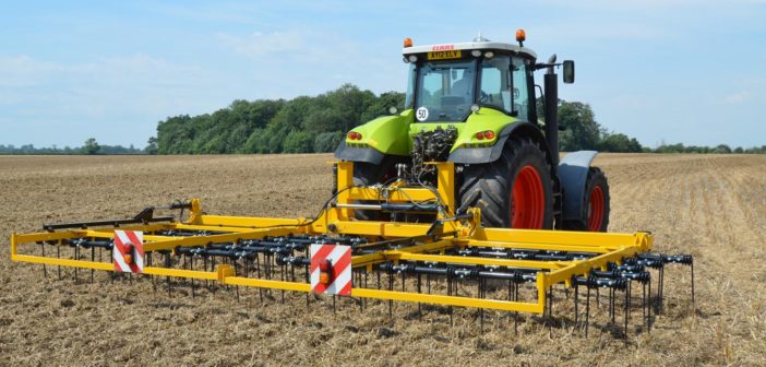 Where necessary the Claydon TerraStar, a simple, low cost 6m shallow cultivator, might be used. Its 68 cross-blade rotors move slightly more soil than the Straw Harrow but much less than traditional tine or disc-based implements. The fine tilth produced by the TerraStar contains a high level of humidity which encourages volunteers and grass weeds to germinate quickly. The implement also levels the field and allows manures or compost to be incorporated yet leaves the soil surface largely intact to support following machinery and allow water to drain away quickly from the surface.