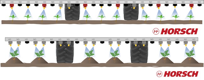 - HORSCH has developed ‘tilted’ sprayer nozzles caps for use in band application and improved wetting in ridge crops