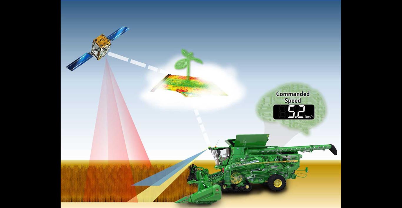 Predictive Feedrate Control is the first feedrate control system which combines two proactive input sources from GPS satellites and cab mounted sensors. This self-learning technology uses forward-looking perception information as well as crop data. The system allows the combine to react to changing harvest conditions and particularly to special situations such as a lodged crop. Predictive Feedrate Control offers an unprecedented level of rate control productivity combined with significantly improved operator comfort in all harvesting conditions.
