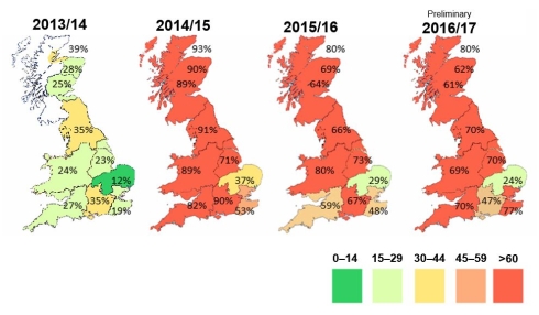 Regional risk is broadly similar to 2015–16. Some regions are, however, at a higher risk this year (South West and South East of England), whereas some are at a lower risk (South of England).