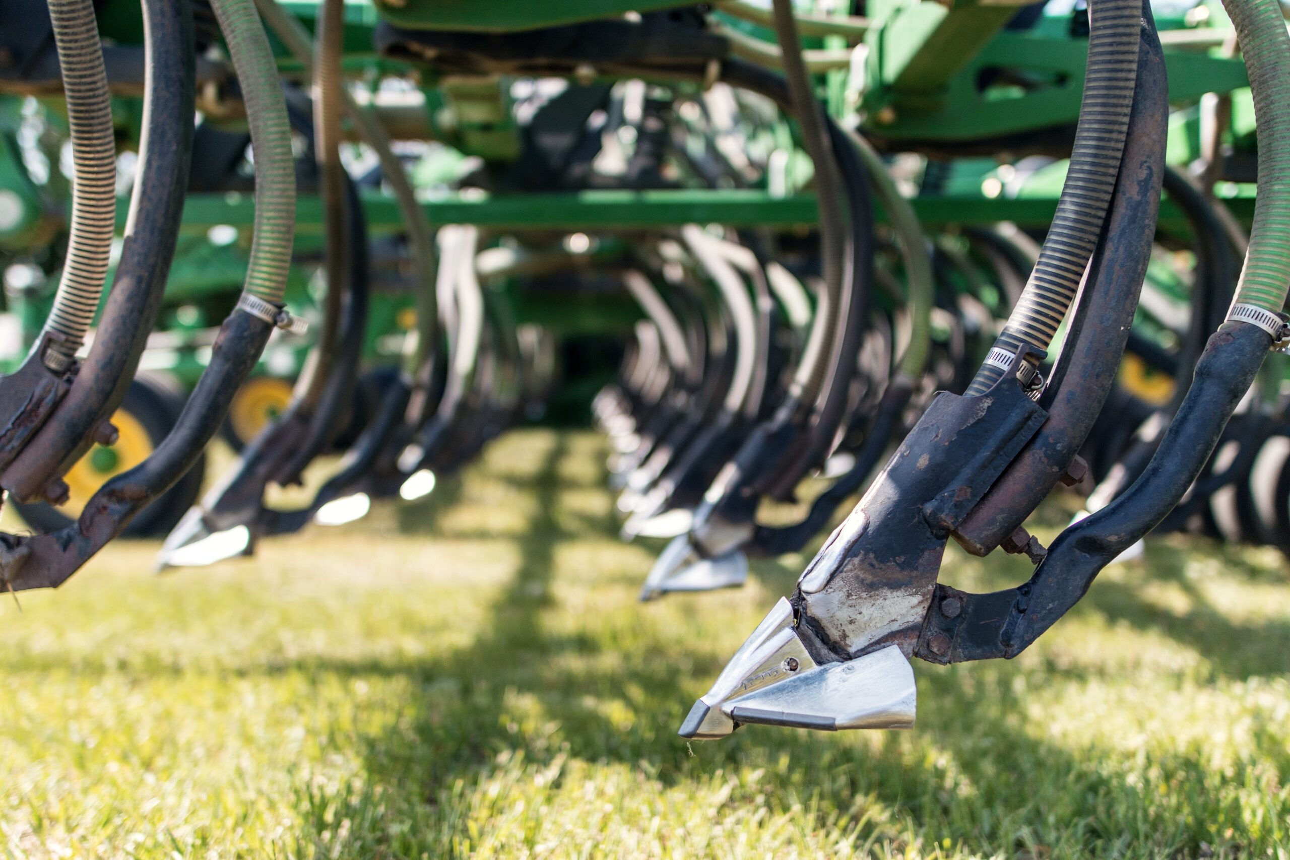 When the liquid or solid fertiliser delivery tubes are attached to the back of the double-row points, fertiliser is placed between and 9.5mm (3/8in) below the seed rows where it is readily available but with sufficient segregation to avoid scorch.