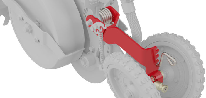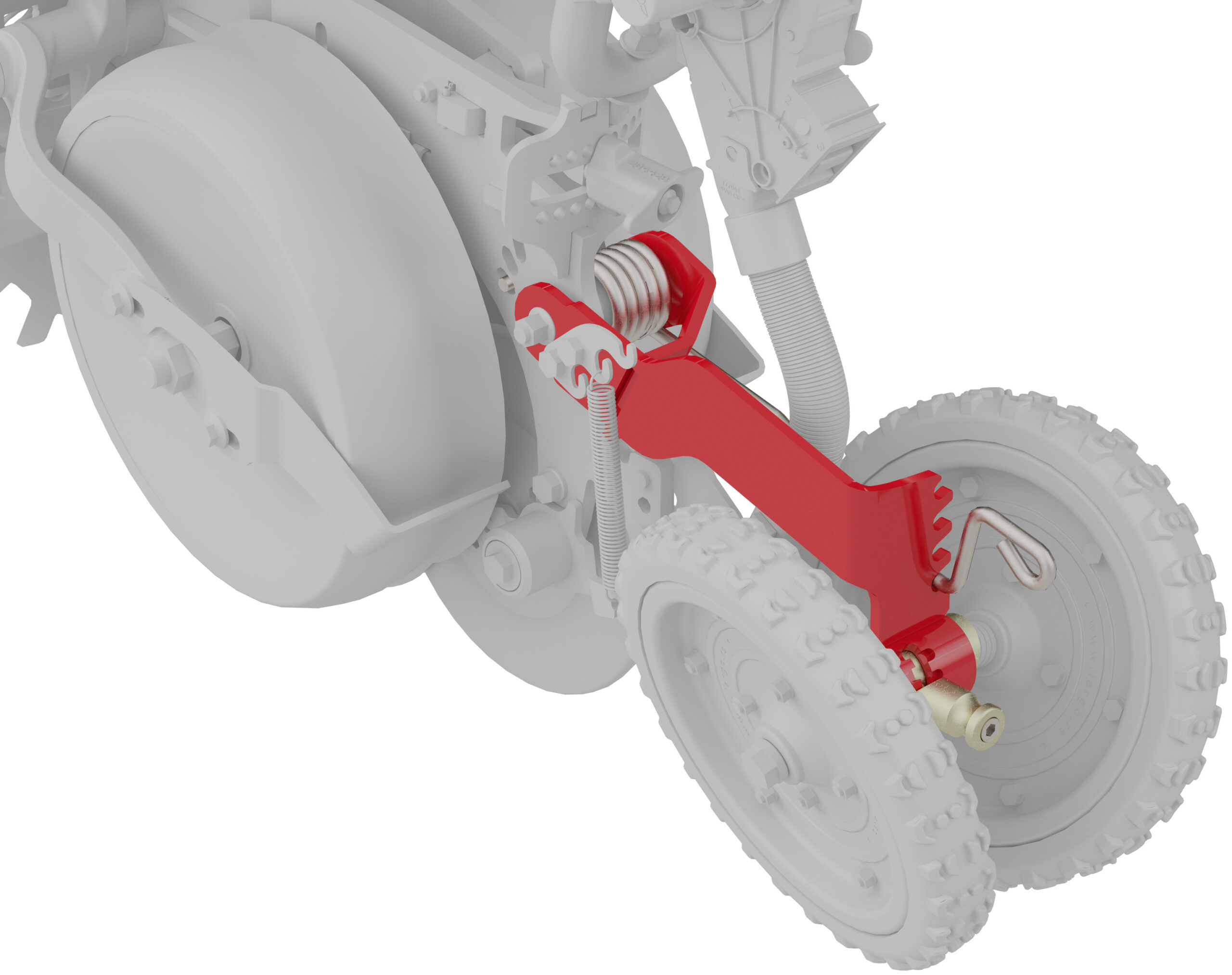 Planting a small seeded crop at shallow depth requires the planter to be very gentle to the seed. The main components of the small seeds kit include suspended stop wheels and the ability to adjust the angle of the closing wheels. The pressure on the stop wheel can be altered to optimise seed-to-soil contact when the seed leaves the seed tube.