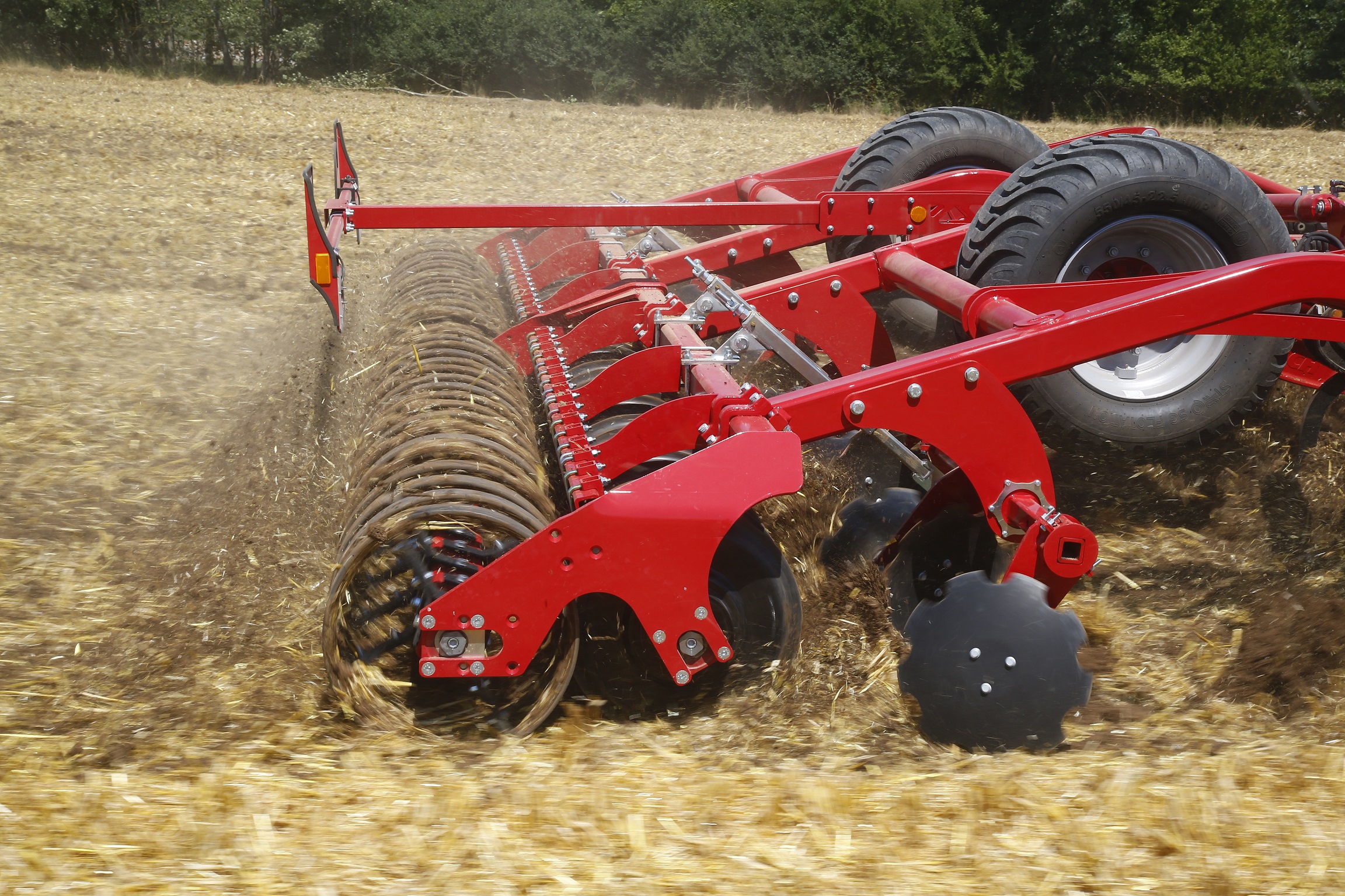 To increase tractive output, the Terrano GX is equipped with a fully integrated tractive power amplifier that transfers up to 1,200 kg weight to the rear axle of the tractor while working by using lifting and lowering hydraulics in a depressurised condition. A choice of levelling discs that aggressively distribute the material in front of the packer and the tine levellers that spread the material are available.