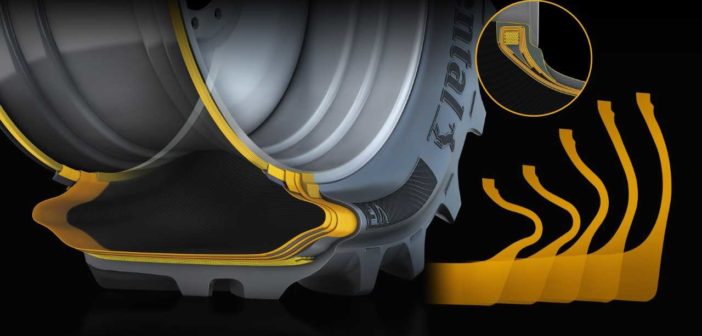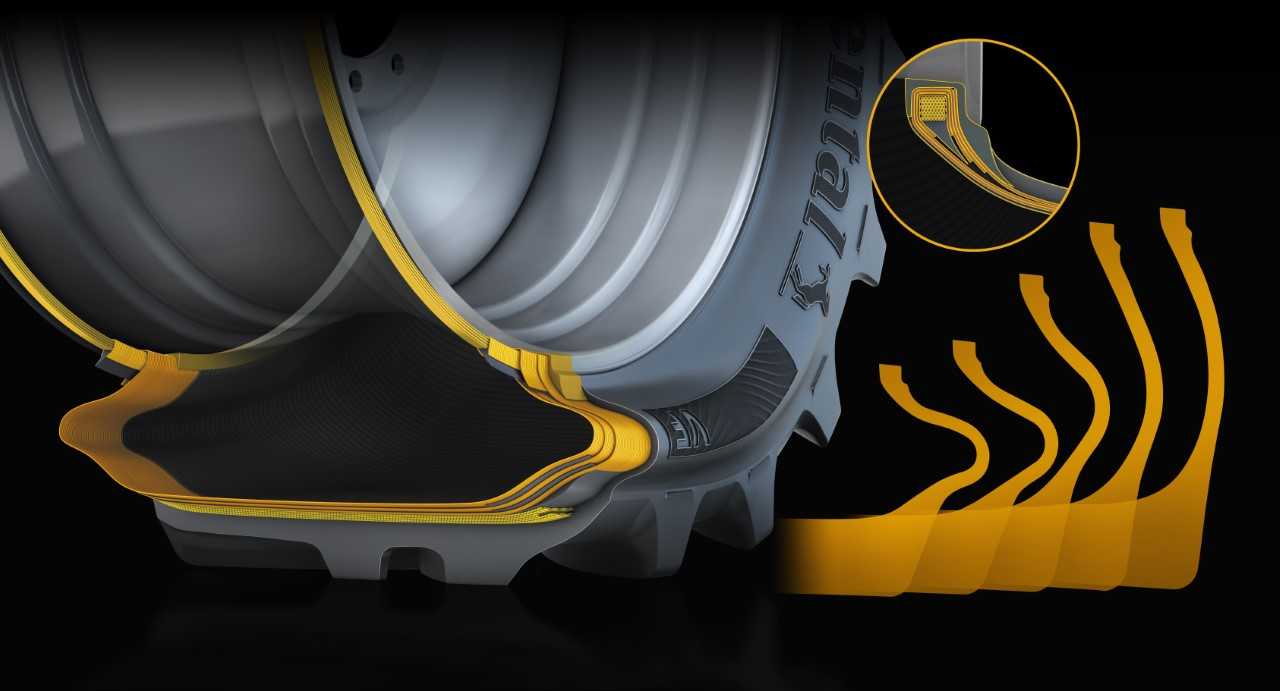 The new range of very high flexion (VF) agricultural tyres, which will be launched at Agritechnica in November, feature a more flexible side wall. On the road this enables the vehicle to carry forty percent more load than a standard tyre at the same pressure.