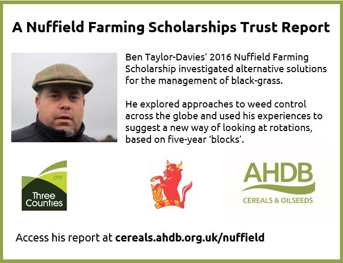 This was a main conclusion of Ben Taylor-Davies’ 2016 Nuffield scholarship which investigated alternative solutions for the management of black-grass.